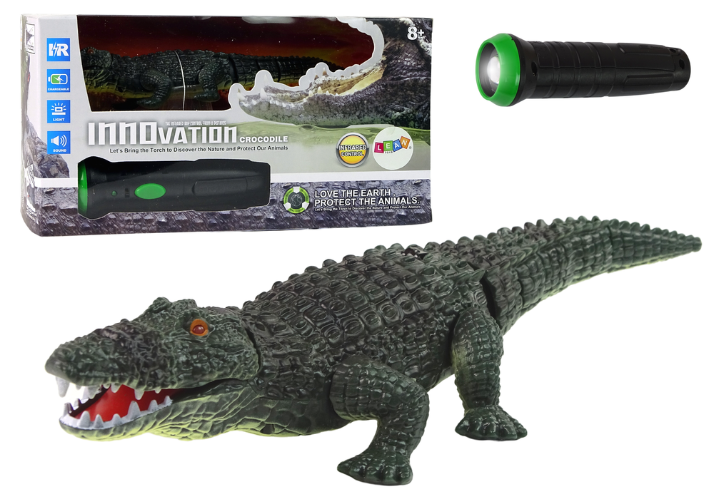 Dálkové ovládání, které je součástí sady, vypadá jako svítilna. Má tři tlačítka – přední, zadní a ovládací tlačítko. Krokodýl reaguje na světlo a následuje ho, takže světlo je jeho dálkovým ovládáním.